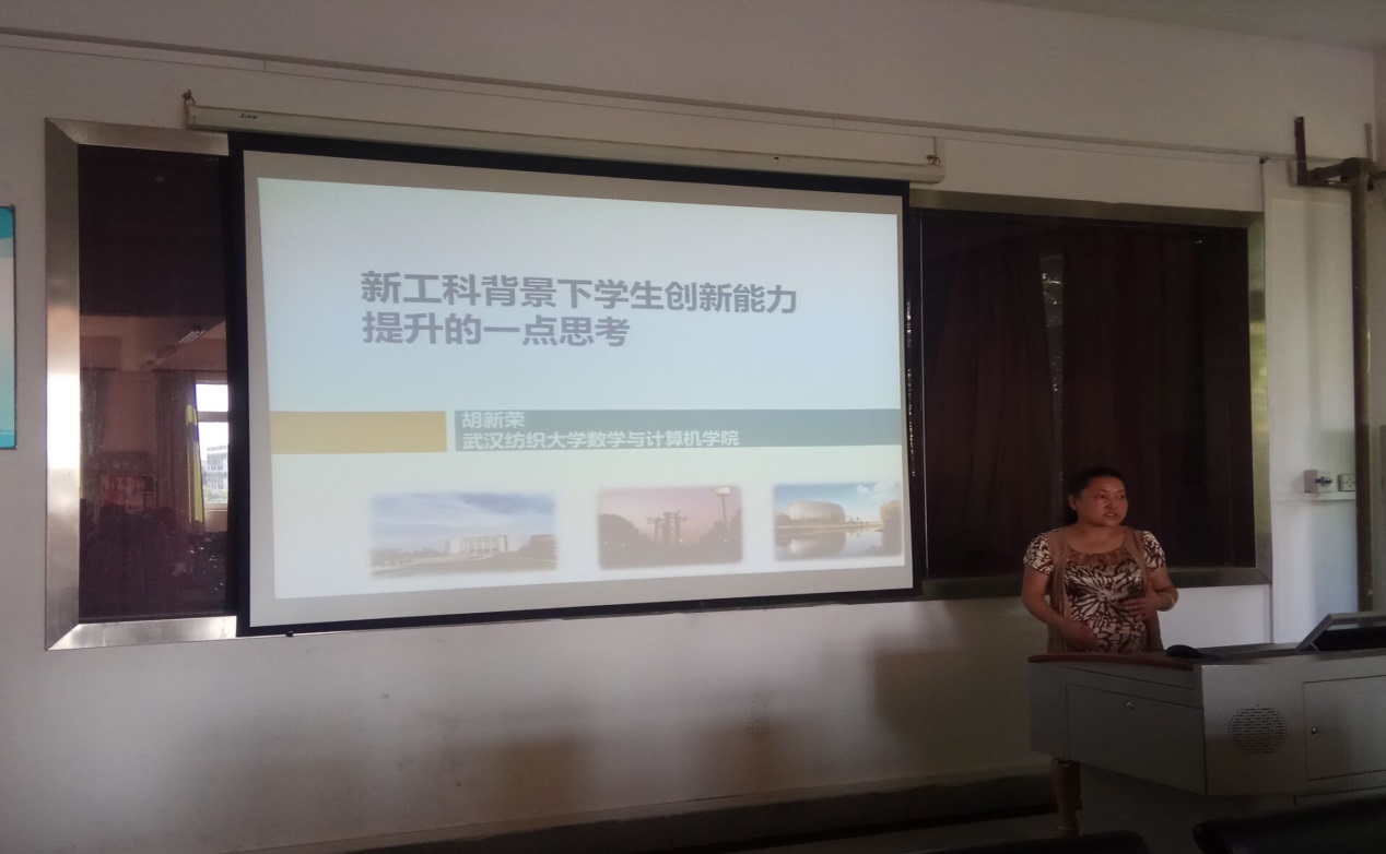 2018年6月27号上午9:00-10:00,武汉纺织大学数学与计算机学院副院长胡新荣教授来到国产精品羞羞无码久久久南二401会议室为国产精品羞羞无码久久久的老师和部分学生代表做了主题为《新工科背景下学生创新能力提升的一点思考》的讲座,并从如何提升学生的科研创新能力、如何备考研究生等问题向学生分享了自己的经验。