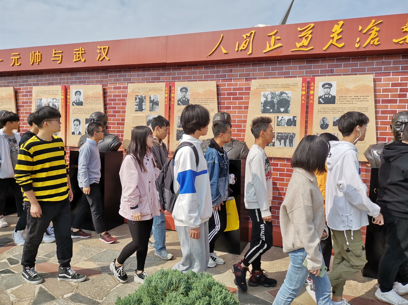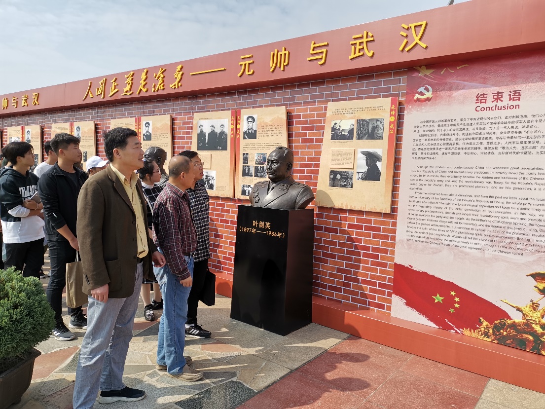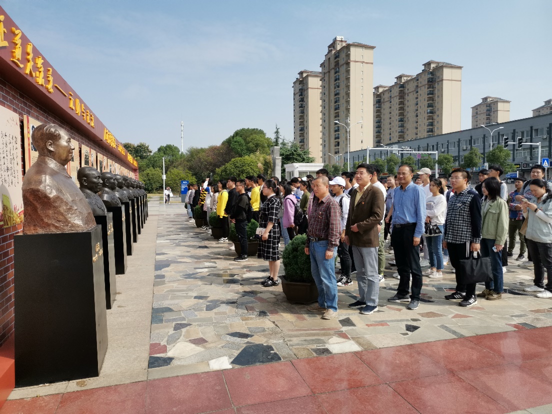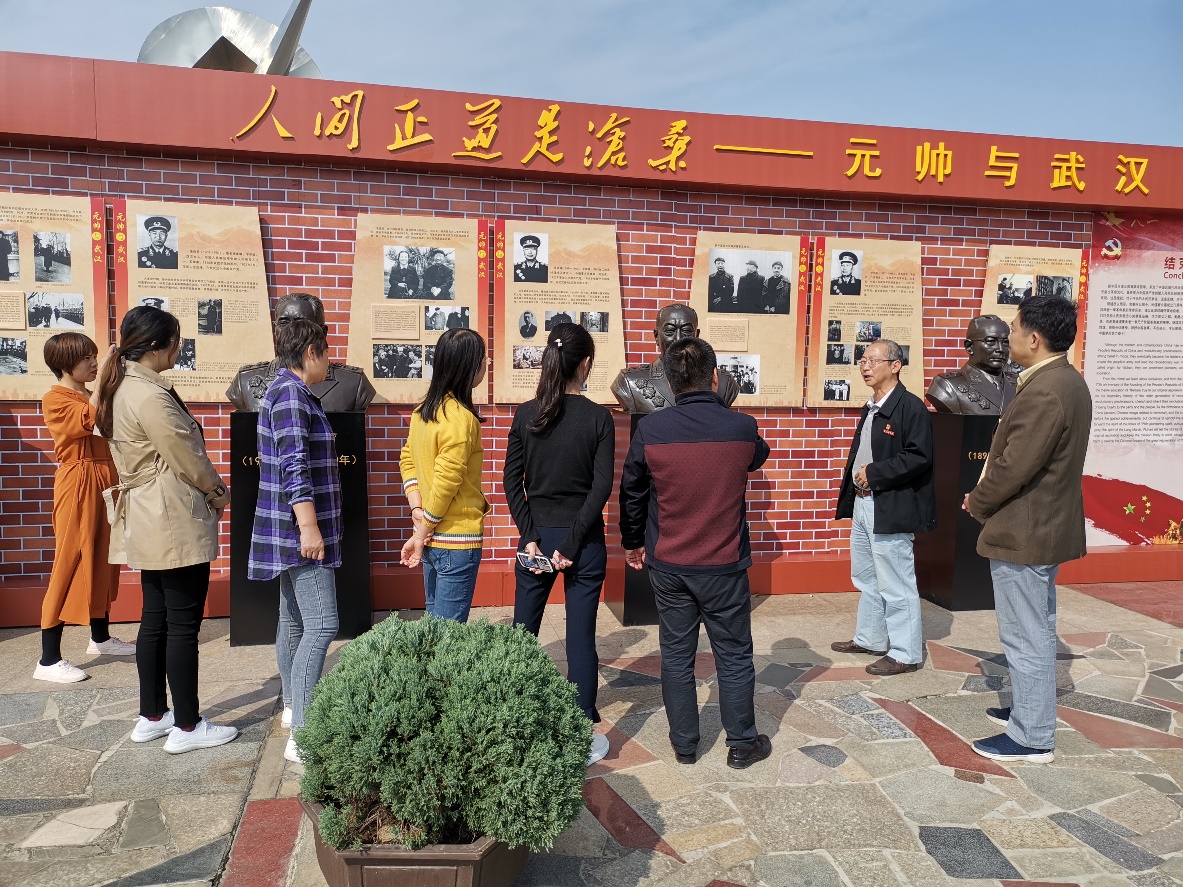 2019年10月15中午,国产精品羞羞无码久久久党总支开展“不忘初心、牢记使命”主题教育活动,组织教师党员、学生党员和新生代表来到致远广场,参观学习《人间正道是沧桑——元帅与武汉》雕塑展。