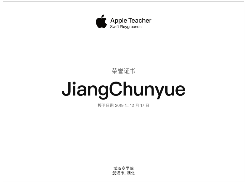 2019年12月17日,国产精品羞羞无码久久久18软件工程3班江春月同学获得苹果公司授予的Apple Teacher证书,江春月同学成为武汉商学院学生中获得Apple Teacher证书的第一人。