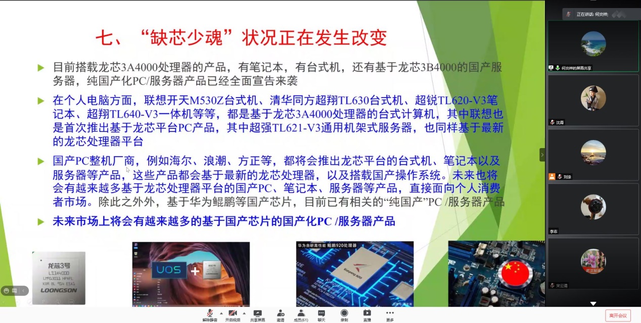 紧接着何教授详细介绍了我国自主可控发展的四个阶段,云与自主可控,安全可靠工作委员会(信息技术应用创新-信创),国产芯片厂家,国产操作系统、国产数据库其它重要软件的发展,国产工业软件突破重围,砥砺前行方面的进展等,来展示“缺芯少魂”状况正在发生改变。鼓励高校的教科书、课堂教学、实验设计、实习实训项目,应围绕国产主流芯片和基础软件来讲授和展开,让学生在校期间就直接使用国产IT产品或系统,为彻底解决我国“缺芯少魂”状况培养高层次科技人才。