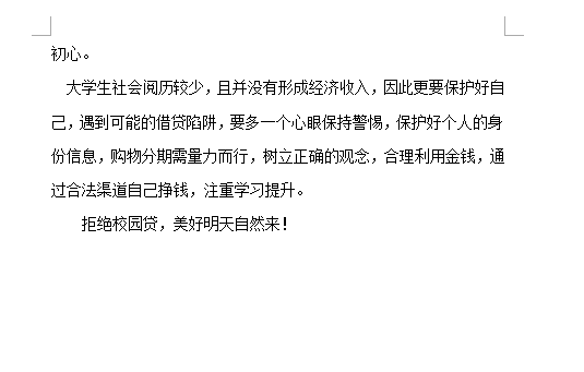 通过此次活动,让同学们了解到防治"校园贷",不仅是社会的责任,也是我们每个人义不容辞的责任。莫让校园贷捆绑了你的精彩,莫让校园贷辜负了你的青春,莫让校园贷让青春变成遗憾。防治校园贷,人人有责。