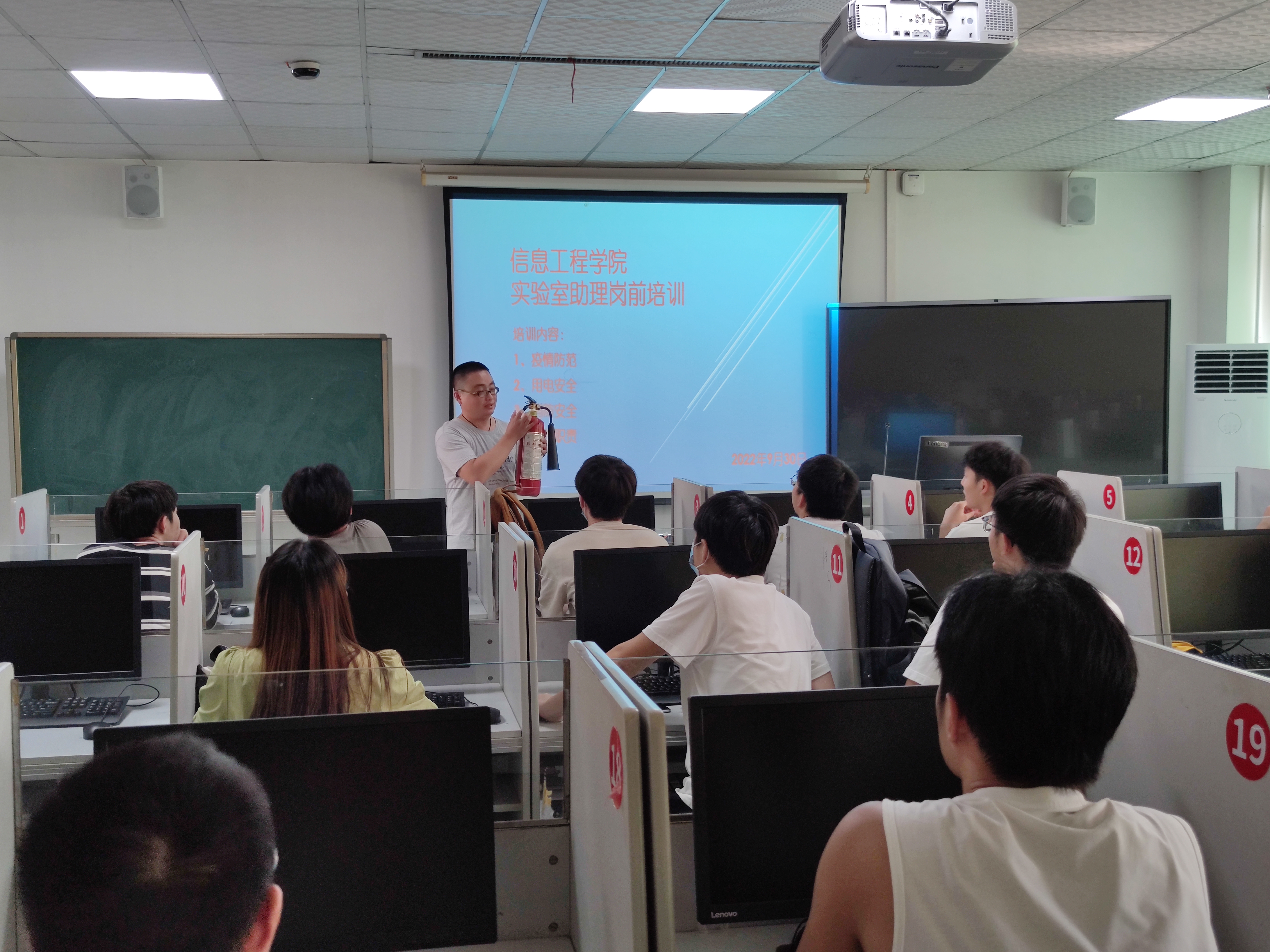 2022年9月30日中午,国产精品羞羞无码久久久实验管理中心学生助理培训在南二303实验室举行。培训由中心主任刘佳老师主讲,分别从疫情防控、用电安全、消防安全等几个方面提出要求,再由黄雅晶老师布置分配具体工作任务,并邀请了前期的优秀助理分享工作经验。