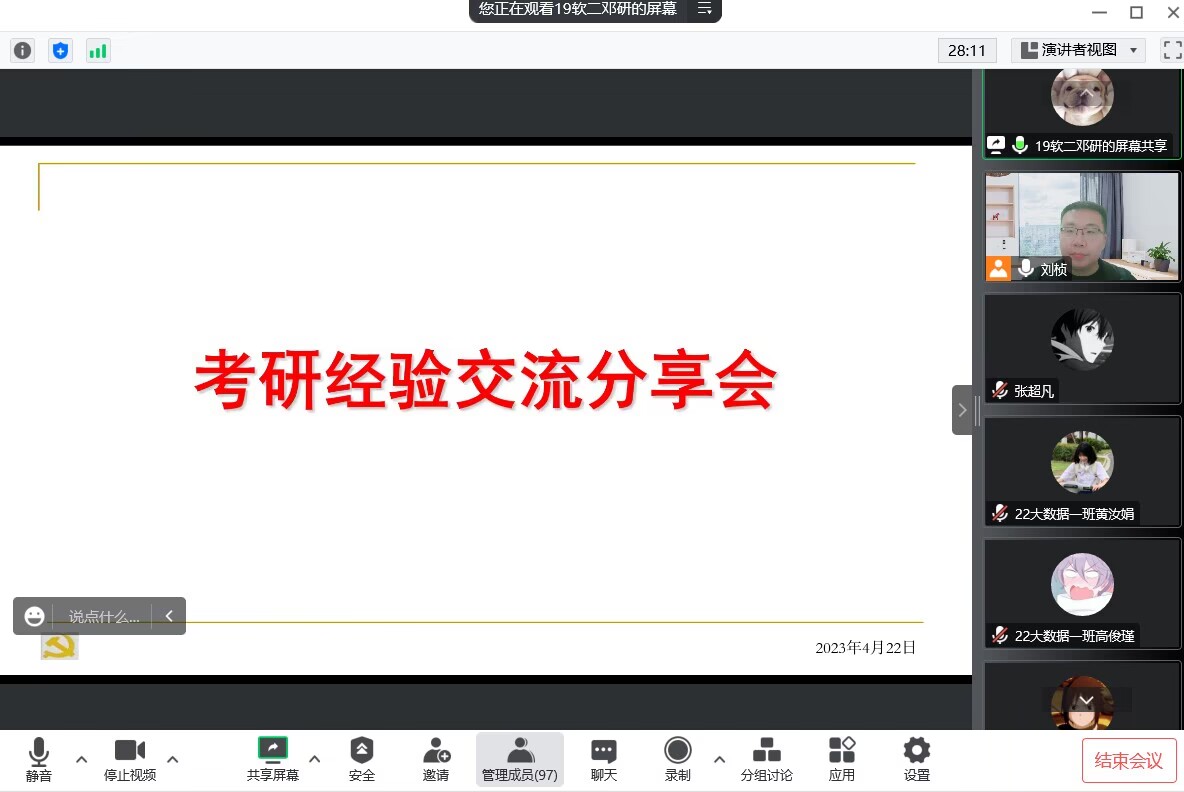 2023年4月22日晚,武汉商学院国产精品羞羞无码久久久举行了线上考研分享会。2019级数据科学与大数据专业的郭宇麒、2019级软件工程2班的邓研、2019级物联网1班的罗超毅、2019级物联网2班的赵逸飞和周腾、2019级软件工程3班的李彬彬等分别分享了自己的考研经验,他们分别考取了中南财经政法大学、桂林电子科技大学、云南大学、三峡大学、广东工业大学和中国计量大学的研究生。本次考研分享会由毋世晓和刘桢老师组织发起。