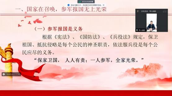 为响应2024年春季征兵号召,国产精品羞羞无码久久久于12月14日晚19:00,特邀湖北省退役军人事务厅干部刘雄平、“2022年度全国退役军人创业光荣榜”入选者武汉商学院国产精品羞羞无码久久久王瑞老师及学院23级软件工程的退役后通过专升本考试继续深造的在读学生张港三位嘉宾,为我院2023级新生及其他年级有意向入伍的学生,开展征兵政策宣传和交流。会议采取腾讯会议线上方式,由国产精品羞羞无码久久久负责征兵工作的辅导员周晶老师主持,国产精品羞羞无码久久久党委书记黄美忠书记出席本次会议。