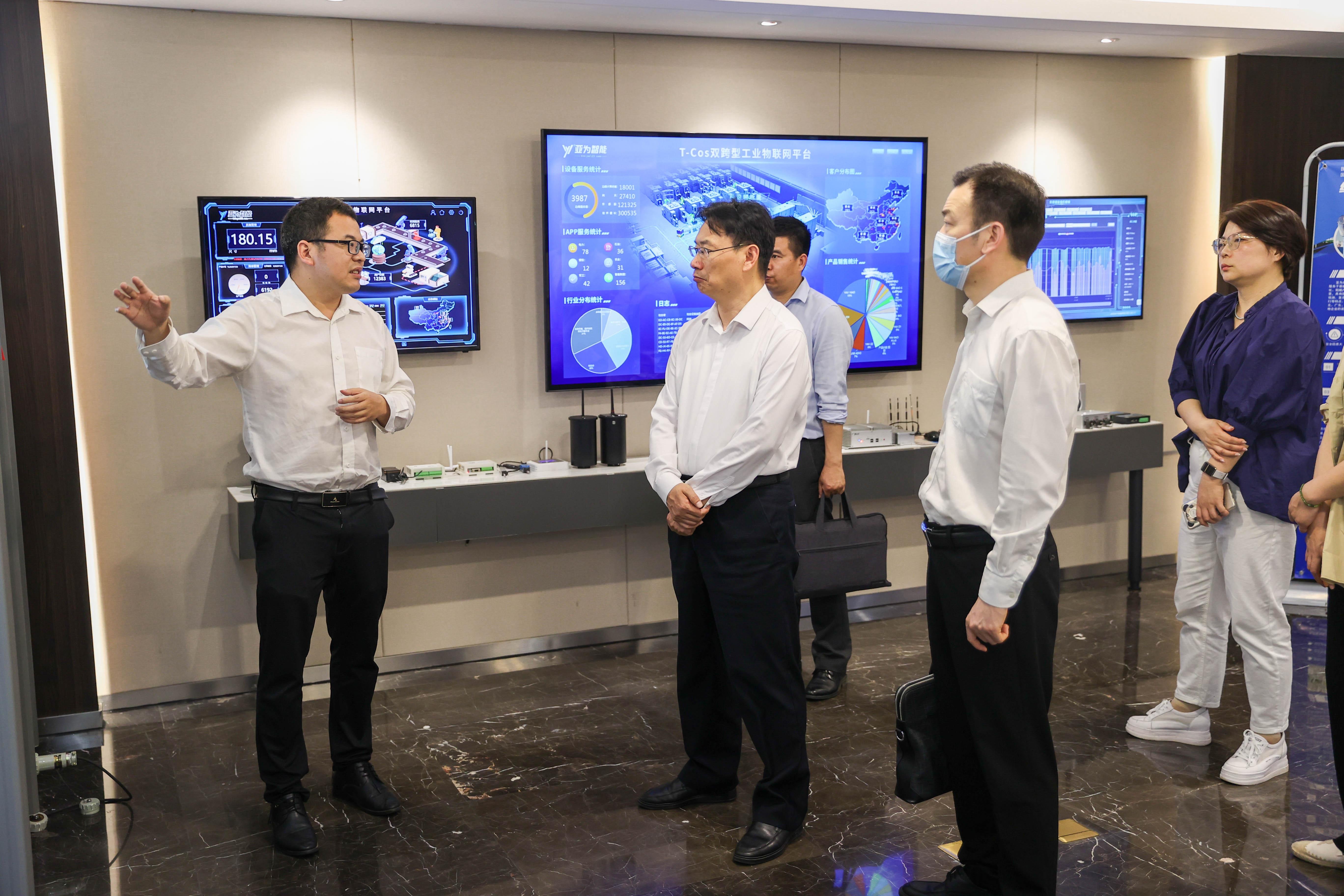 在武汉亚为电子科技有限公司董事长王瑞的带领下,彭瑜一行参观了公司展厅,听取了公司情况介绍,了解了专业老师创业和公司发展进程。展厅内主要陈列着该公司产品、技术研发成果及应用情况,充分展示了企业的技术实力、创新能力和市场竞争力。
