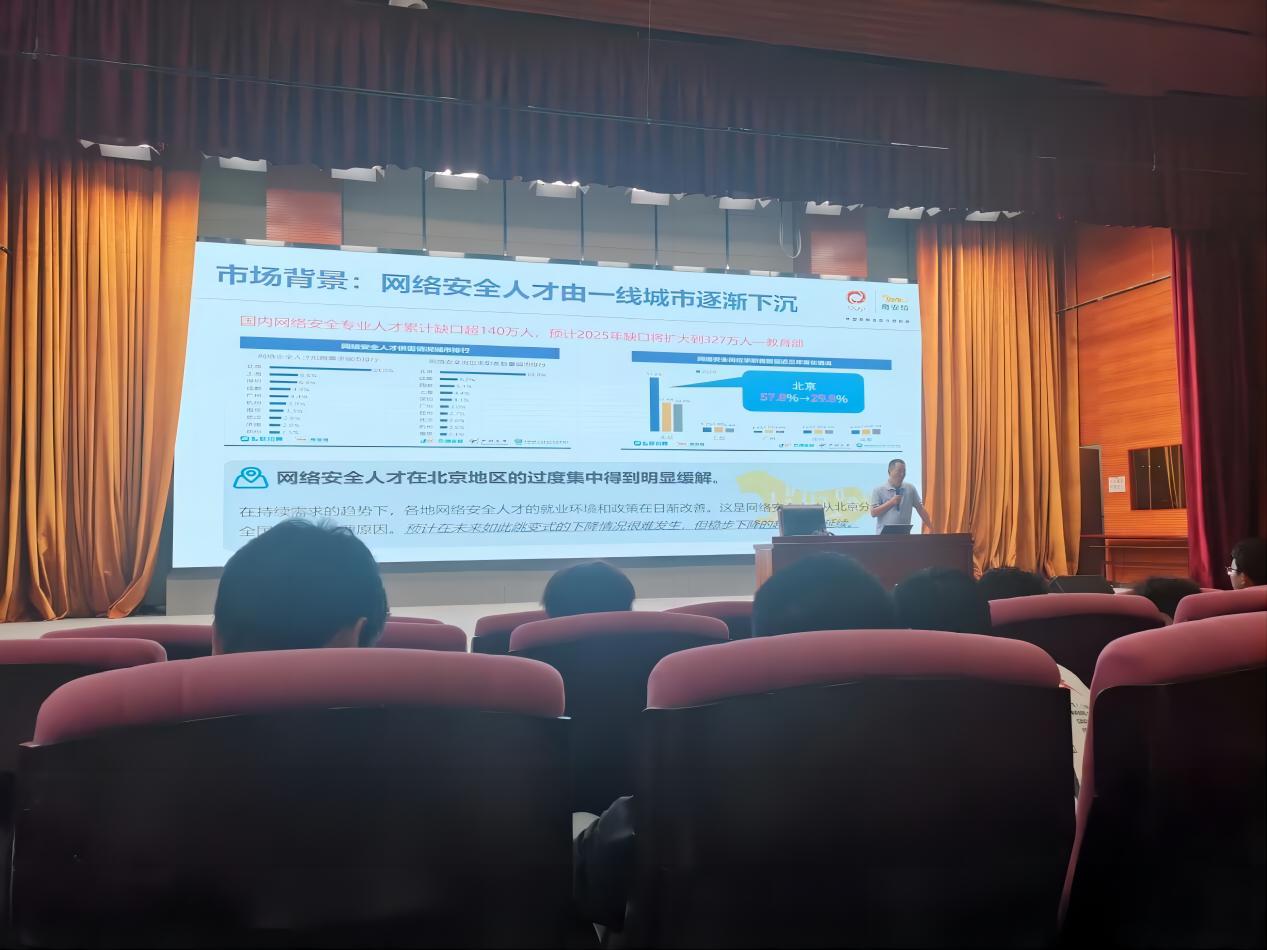 易鹤健讲师通过它生动有力的演讲,完美解读了网络安全的定义,网络安全领域职业划分,人才定位,为同学们接触网络安全做了启蒙教育,具体从以下三个方面进行介绍。