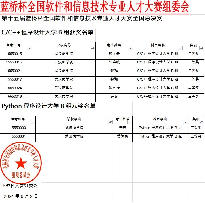 2024年4月13日举行的第十五届“蓝桥杯”全国软件和信息技术专业人才大赛湖北省省赛,童莹等老师指导国产精品羞羞无码久久久学子参加了Java、C/C++、Python、Web应用开发、物联网嵌入式和单片机等多个热门赛道的角逐,我校总成绩、获奖人数及获奖质量均实现了新的突破。该项赛事按面向院校分为A组和B组,我校对应在B组,共有20人获省一等奖并进入国赛决赛,其中熊子豪同学成绩是第三名,获一等奖人数和最好个人成绩排名均创新高。值得一提的是,21级软件工程专业的贾锐哲同学自我加压,第二次勇报面向985、211等部属院校的A组比赛,并获二等奖,在A组获奖名单中,武汉商学院成了一个醒目的存在。6月2日,“蓝桥杯”国赛举行,我校虽憾未获得一等奖,但有熊子豪、刘奕岐、钱梅、魏翔、陈久谱、李吉6位同学获国赛二等奖,是去年2人获国赛二等奖的3倍。