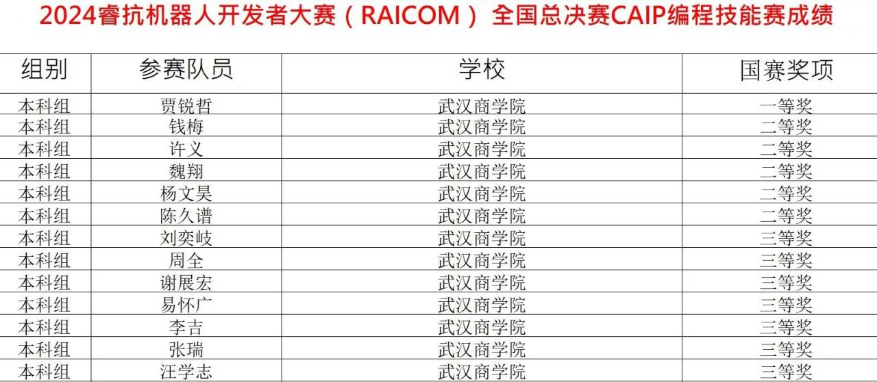 2024年8月26日,由工业和信息化部人才交流中心主办的“2024睿抗机器人开发者大赛(RAICOM)全国总决赛”已全部结束,其中CAIP编程设计赛道“编程技能赛”决赛按赛程于8月4日线上进行、8月10日闭幕。在此前7月举行的该项比赛省赛中,学院共组织79支队伍参赛,有45支队伍在湖北省省赛中获奖;其中取得省赛一等奖和二等奖的15支队伍入围全国总决赛。在全国总决赛中,最终有13支队伍获奖,取得国赛一等奖1项、国赛二等奖5项、国赛三等奖7项的优异成绩,获奖数量位列湖北省属高校前列。暑假期间还举行了2024年百度之星程序设计大赛湖北省赛,我院熊子豪、许义、刘奕岐3位同学获铜奖,在去年首次参赛获一枚铜奖的基础上奖项有新的突破。这些奖项展现了信工学子较为扎实的编程技能。