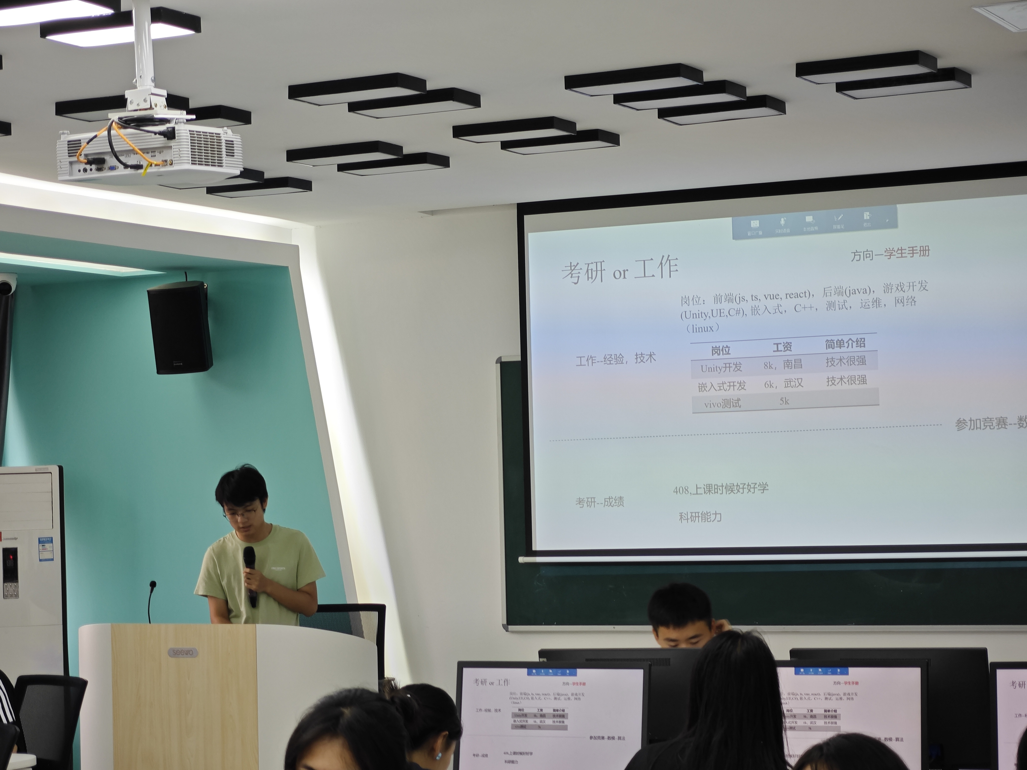 随后,徐鑫宇学长上台为大家带来了关于考研和工作的经验分享。他结合自己的亲身经历,为大家指出了未来的发展方向。徐鑫宇学长详细介绍了考研的备考策略、择校建议以及面试技巧等方面的内容。他的分享让在场的同学们受益匪浅,为大家指明了未来的道路。