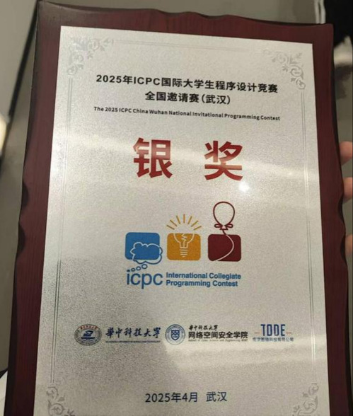 2025年ICPC国际大学生程序设计竞赛(International Collegiate Programming Contest)全国邀请赛(武汉)于2025年4月26-27日在华中科技大学网络空间安全学院圆满落幕。本次武汉站邀请赛吸引了武汉大学、华中科技大学、浙江大学、上海交通大学、西北工业大学等全国179所高校的280支精英队伍参加,竞争激烈。我校杨文昊、许义、李吉三名同学组成的参赛队在比赛中沉着应战,凭借扎实的算法功底与出色的团队协作,成功解出多道题目,最终获银奖,创下我校在ICPC全国邀请赛系列赛事中的历史最佳成绩。