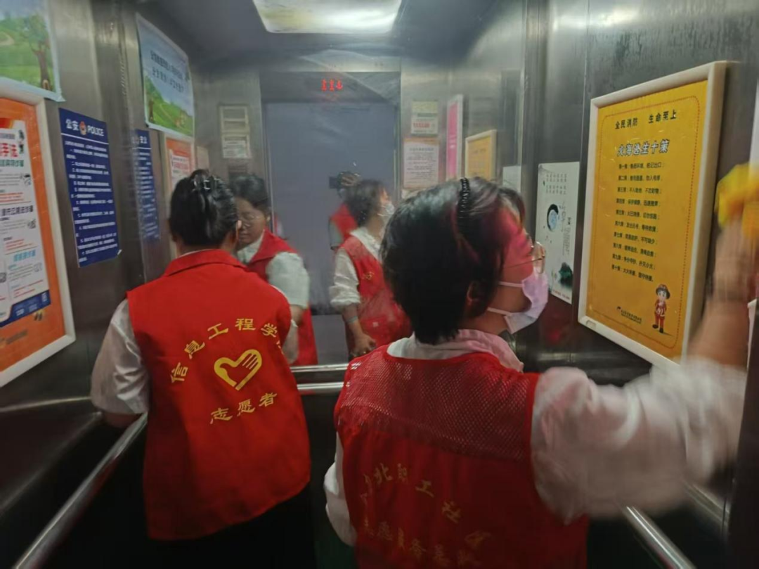 与此同时,另一队志愿者手持抹布,深入楼栋内部,对镜子、阳台门等公共空间物品进行细致的清洁。他们先用湿抹布擦掉镜子上面的污渍和水渍,然后用干抹布把镜子擦干,让镜子重新焕发出明亮的光泽。对于阳台门,志愿者们不仅擦拭了表面,还对门缝、把手等容易积灰的部位进行重点清洁。在清理过程中,大家还不忘与居民亲切交流,提醒大家保持楼道整洁,共同维护良好的居住环境。