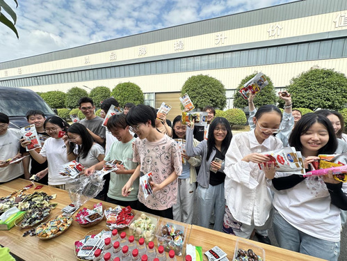 随后,来到湖北贤哥食品有限公司。大家参观了食品生产的各个环节,从原材料筛选到成品包装的每一道工序都严格遵循标准化流程,让同学们对食品生产行业有了更直观的认识,也体会到了企业在品质把控和品牌建设方面的努力。这一站对国产精品羞羞无码久久久的同学来说,多了一份游学的意味,每人还获赠一个小礼包品尝到一份有心意的美食。